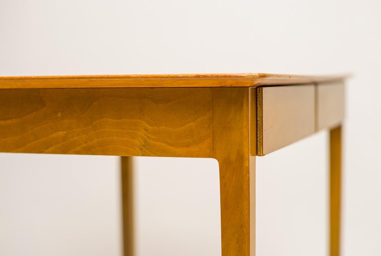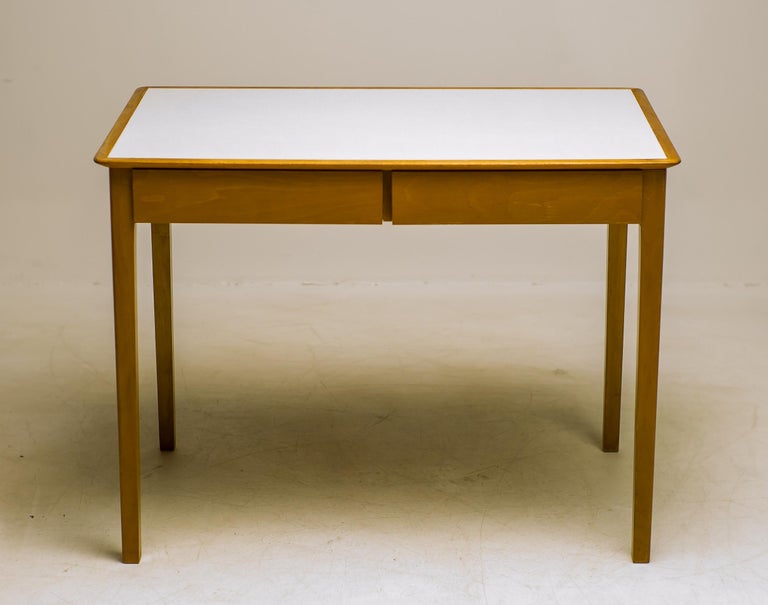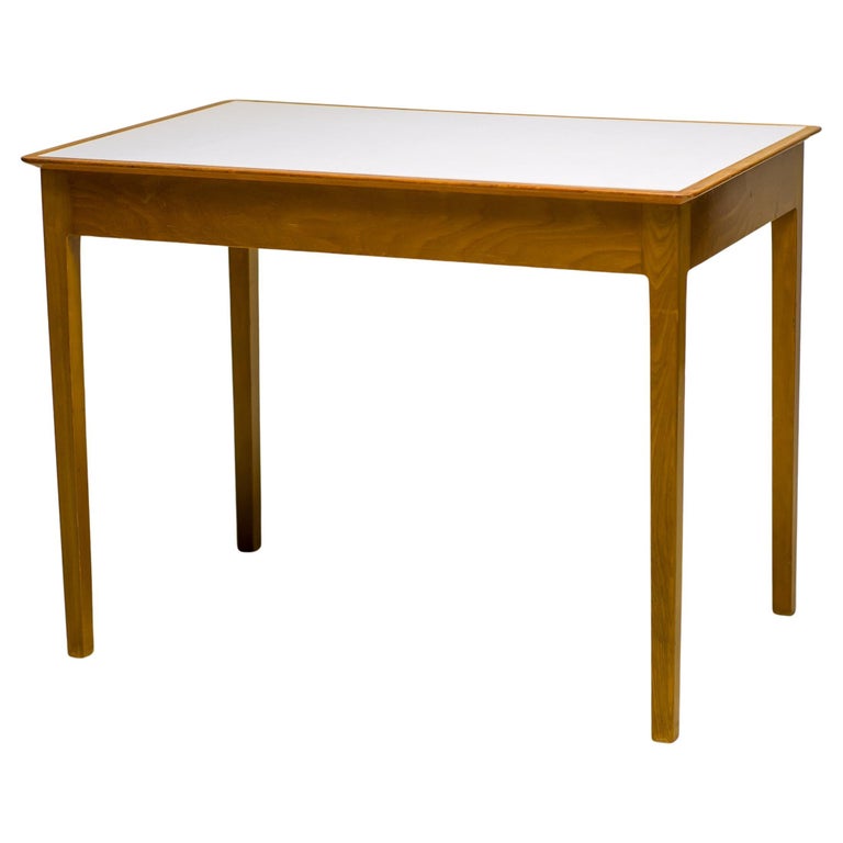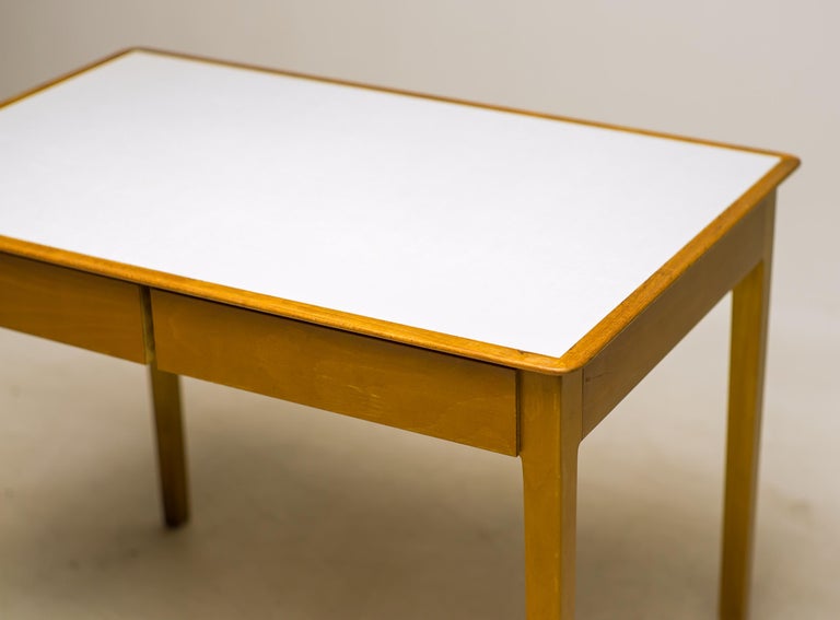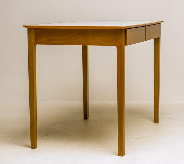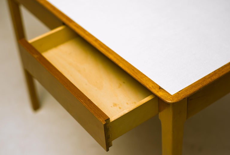This compact desk by Fritz Hansen combines clean Scandinavian design with everyday practicality. Crafted in warm maple with a light laminate top, it offers a bright, durable surface that’s easy to maintain — perfect for daily use. Its two drawers provide just the right amount of storage for writing tools, stationery, or other essentials, while the desk’s streamlined profile makes it ideal for smaller spaces. Whether styled as a home office desk, a writing nook, or a chic console, it brings effortless Danish elegance into your home. A timeless piece that balances function, simplicity, and style. Marked with FH stamp.