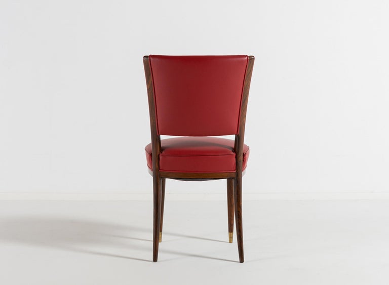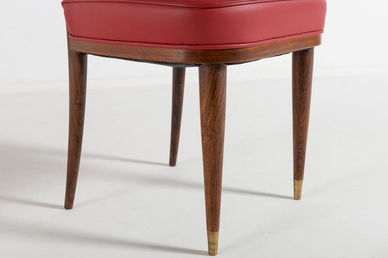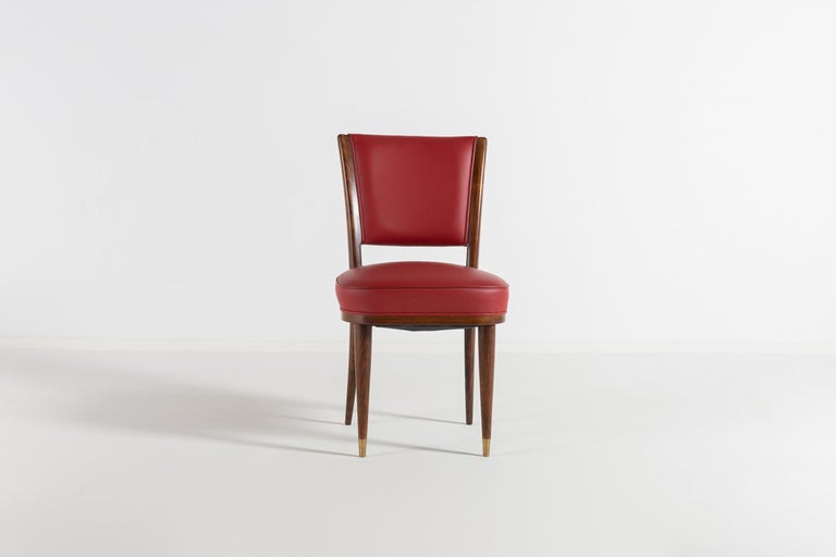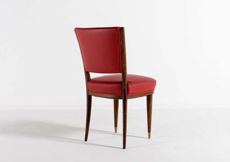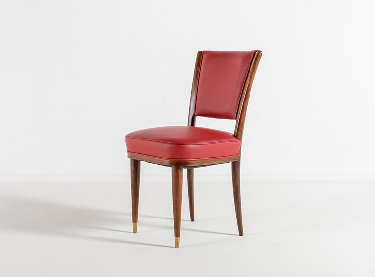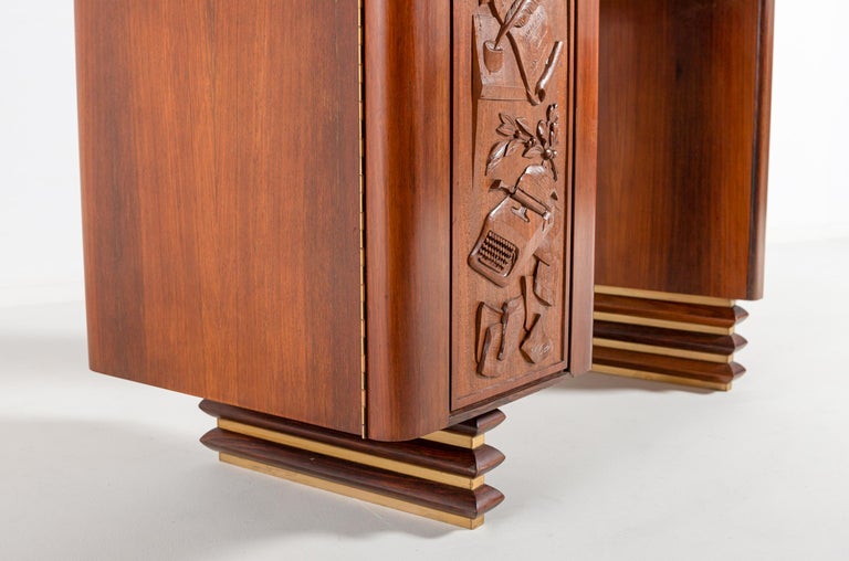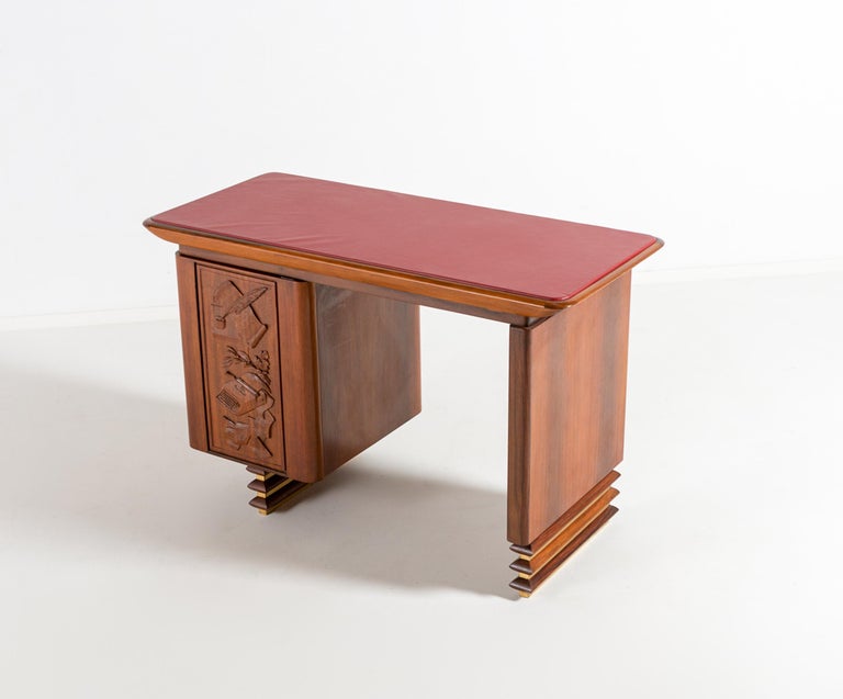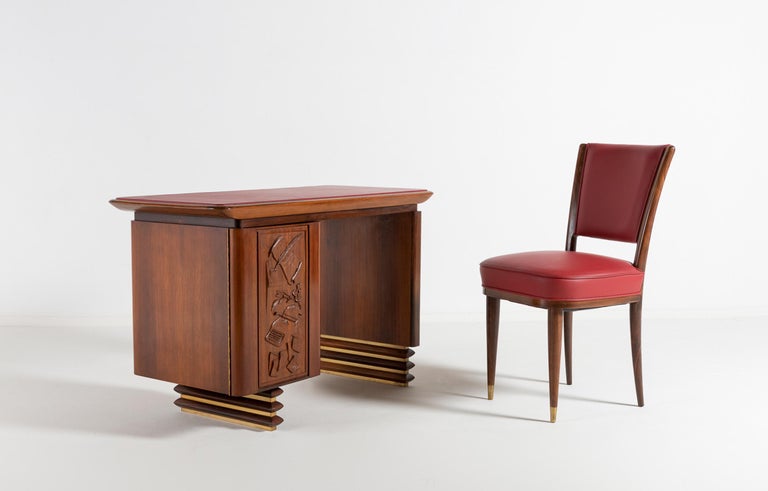 Avant-Garde Elegance: Italian Walnut Desk with Original Red Leather and Carved Stationary Motifs, with Matching Side Chair. A Bespoke Commission for an Executive Villa in Southern Italy, 1960. Presenting a rare and deeply personal glimpse into Italian bespoke design of the mid-century. This exquisite desk and matching side chair were commissioned in 1960 by an Italian executive for his private villa in the South of Italy. Designed by an interior architect with an avant-garde vision, this suite transcends the typical office furniture of the era, offering instead a sculptural and narrative work of art. At first glance, the desk commands attention with its clean, modernist silhouette. The generous rectangular top is sheathed in its original red leather—a rich expanse of color that anchors the room and invites serious work. Yet, it is the hidden drawer unit that reveals the soul of this piece. The front of the drawer unit is not merely functional; it is a canvas. Here, the solid walnut has been masterfully carved with delicate, precise images of writing tools and stationary. A three-dimensional celebration of the art of correspondence. This remarkable carving transforms a piece of office furniture into a personal narrative, blending the executive’s profession with the architect’s artistic flair. The craftsmanship is exceptionally high. The joinery is flawless, the integration of the walnut case with the leather top is seamless, and the chair echoes the same commitment to quality with its sculptural rosewood frame and period-correct red leather upholstery. This is not a production piece; it is a one-off commission. It was conceived by an interior architect as part of a larger vision for a specific place and person—the villa of an Italian executive. This context imbues the set with a soul that factory-made furniture can never replicate. Both the desk and the chair have been used with the utmost care over the decades, surviving in excellent vintage condition, with the original red leather adding to their authenticity and charm. A museum-quality ensemble that captures the spirit of Italian innovation in 1960. For the collector or design aficionado, this suite offers a unique opportunity to own a piece of bespoke history—a true one-off that combines avant-garde design with intimate, hand-carved storytelling.