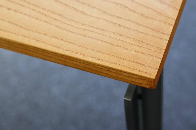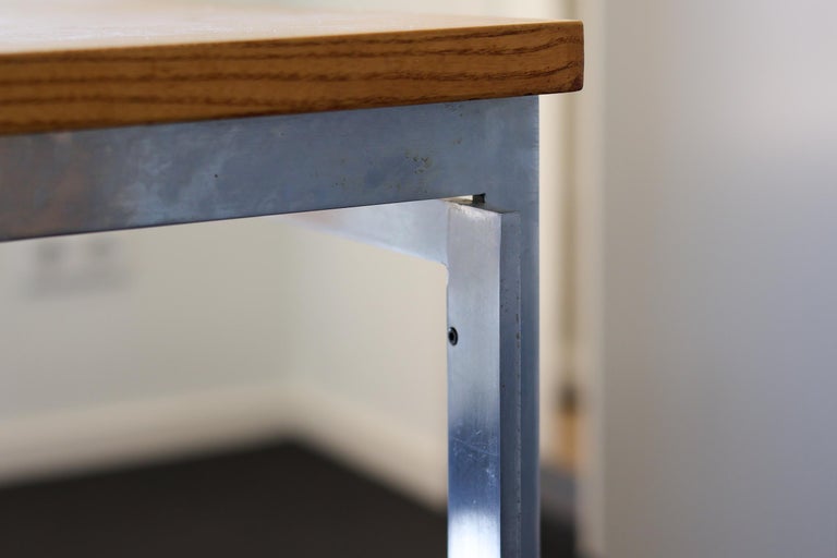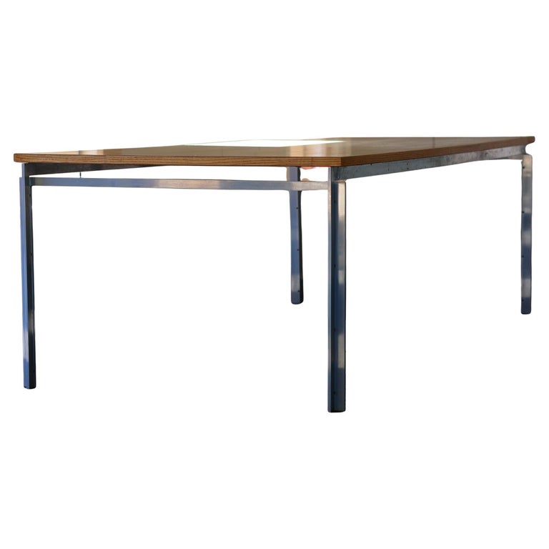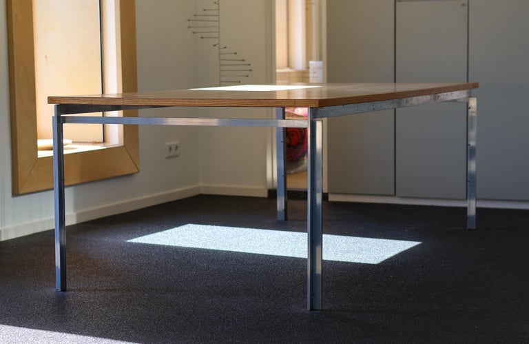 Exceptionally well preserved example of iconic work / dining table model PK55 designed by Danish architect Poul Kjaerholm in 1957, manufactured by Ejvindt Kold Christensen according the stamped logo at the inside of the frame (photographed). Largest version of this great design. Beautiful wood grain ash table top on matte chrome-plated steel base. This piece is part of an important collection of early Kjaerholm pieces carefully curated by an art loving couple for their architectural villa in The Netherlands. The villa is sold and their other house and art museum don’t match with the Kjaerholm aesthetics. We will list more pieces of this collection soon. This piece is in fine vintage condition with a few cane blemishes as pictured.