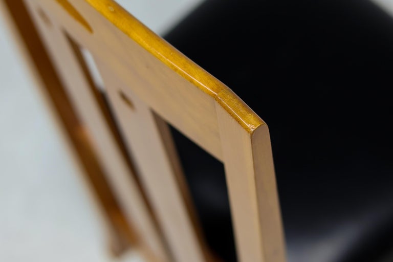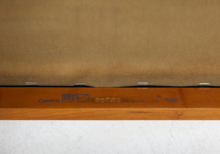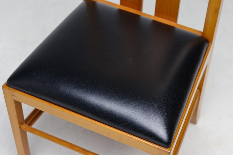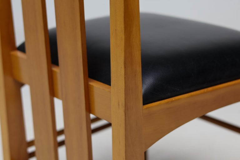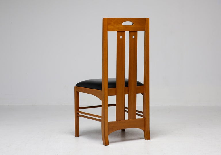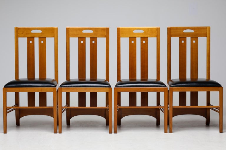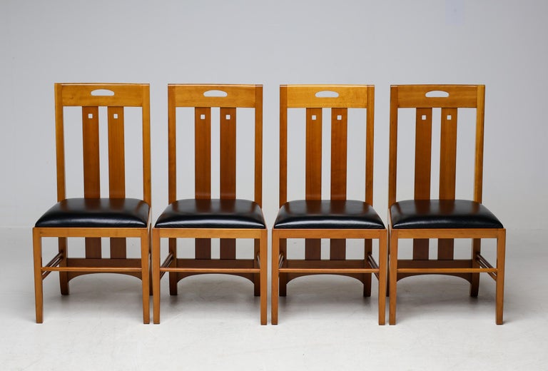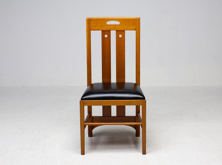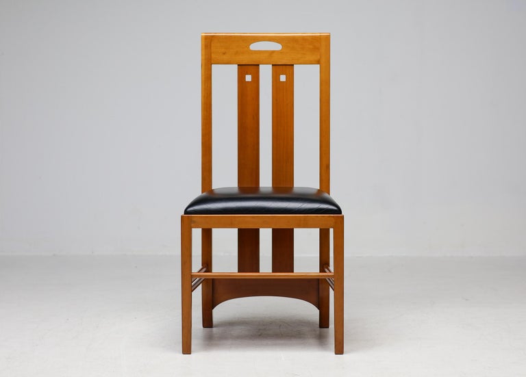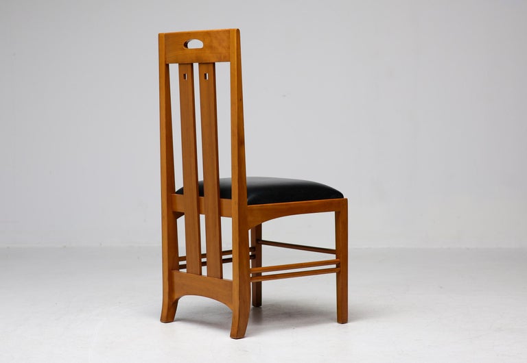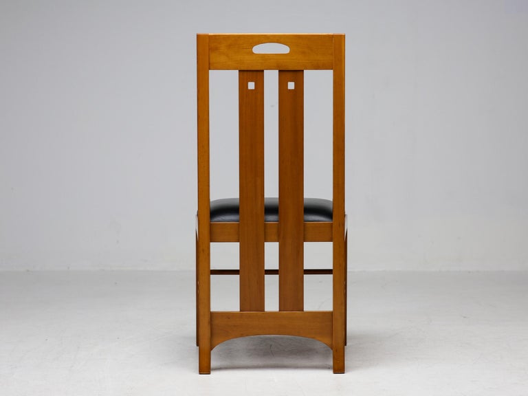 Exquisite set of 4 Charles Rennie Mackintosh “309 Ingram” dining chairs for Cassina in stained cherry and black leather. The 309 Ingram dining chairs, designed by Charles Rennie Mackintosh in the early 20th century, exemplify his distinctive fusion of Art Nouveau and modernist principles. Created for the Ingram Street Tea Rooms in Glasgow, these chairs are known for their high, narrow backs, geometric lines, and minimalist elegance. Crafted from stained cherry with subtle decorative cut-outs, the 309 chairs reflect Mackintosh’s refined aesthetic and his interest in proportion, craftsmanship, and function. Their tall backs not only create visual drama but also offer a sense of enclosure and intimacy, aligning with his holistic approach to interior design. These chairs showcase Mackintosh’s mastery in transforming simple materials into artful, architectural forms. The original black leather upholstery is still in excellent vintage condition. Marked with signature and serial number underneath the base, made in 1996. Original numbered Cassina certificate also present for all 4 chairs.