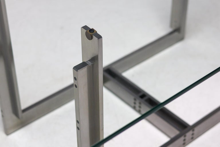 A masterful example of Carlo Scarpa’s design brilliance, this Sarpi Table was created for Simon Gavina in Bologna, Italy, in 1970. The table features a brushed stainless steel frame held together with Scarpa’s signature visible recessed screws, showcasing meticulous craftsmanship and architectural precision. The glass top with elegantly rounded edges rests securely on the frame, supported by round brass fittings with rubber inserts, combining industrial detail with subtle refinement. The interplay of metal, brass, and glass exemplifies Scarpa’s thoughtful material contrasts and functional elegance. Offered in excellent vintage condition, this table is both a timeless functional piece and a collectible work of art, perfect for design enthusiasts and Scarpa collectors alike. From architecture to works in glass, from design projects to preparing museum exhibitions, the work of Carlo Scarpa has always stood out in the unmistakable way in which it manages to bring together his love for materials, his attention to detail and his masterly elaboration of organic and Wrightian poetics.