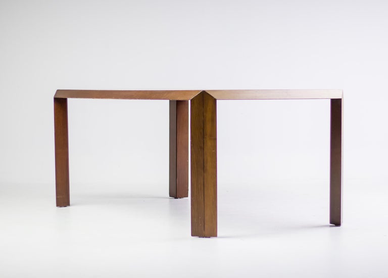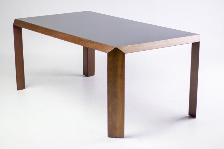 A rare and architecturally refined Talete dining table designed by Gabriele Regondi and Pierluigi Ghianda for Rosenthal. This model exemplifies the designers’ synthesis of structural clarity, material precision, and masterful craftsmanship—hallmarks of Rosenthal’s ambitious design program during the period. The table is defined by its striking top: black safety glass reinforced with an integrated steel wire grid. The embedded grid introduces a subtle industrial vocabulary while serving a structural function, creating a refined interplay between transparency, reflection, and linear pattern. The darkened glass surface possesses depth and presence, its taut geometry contrasting elegantly with the warmth of the supporting frame. The base is executed in solid ash, dark stained to accentuate the wood’s grain while maintaining a restrained, architectural profile. The construction reflects Ghianda’s celebrated expertise in fine woodworking—precise joinery and balanced proportions lending the piece both visual lightness and structural integrity. The Talete model stands as a sophisticated dialogue between industry and craftsmanship: the cool rationality of glass and steel harmonized with the tactile richness of solid wood. Its clean lines and measured proportions make it equally compelling in minimalist, modernist, or contemporary interiors. An uncommon and highly collectible example of late 20th-century Italian design, representing Rosenthal’s commitment to experimental materials and collaborative innovation.