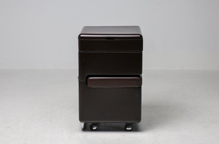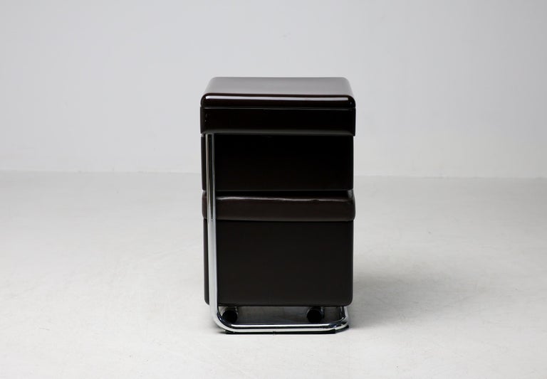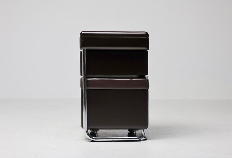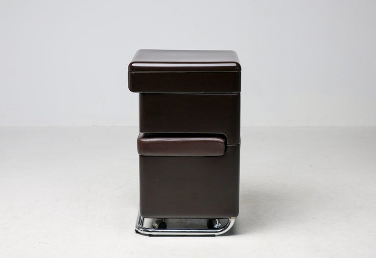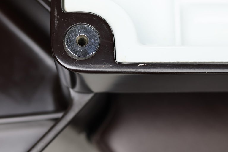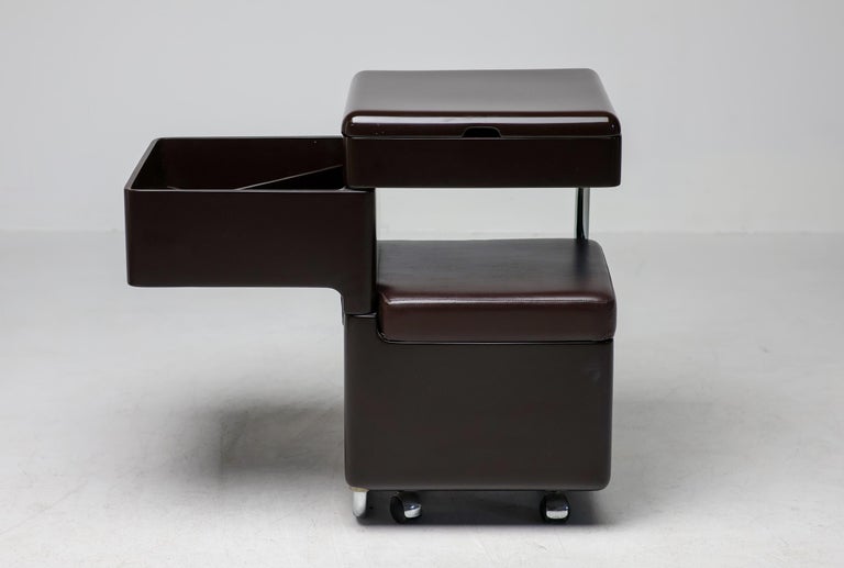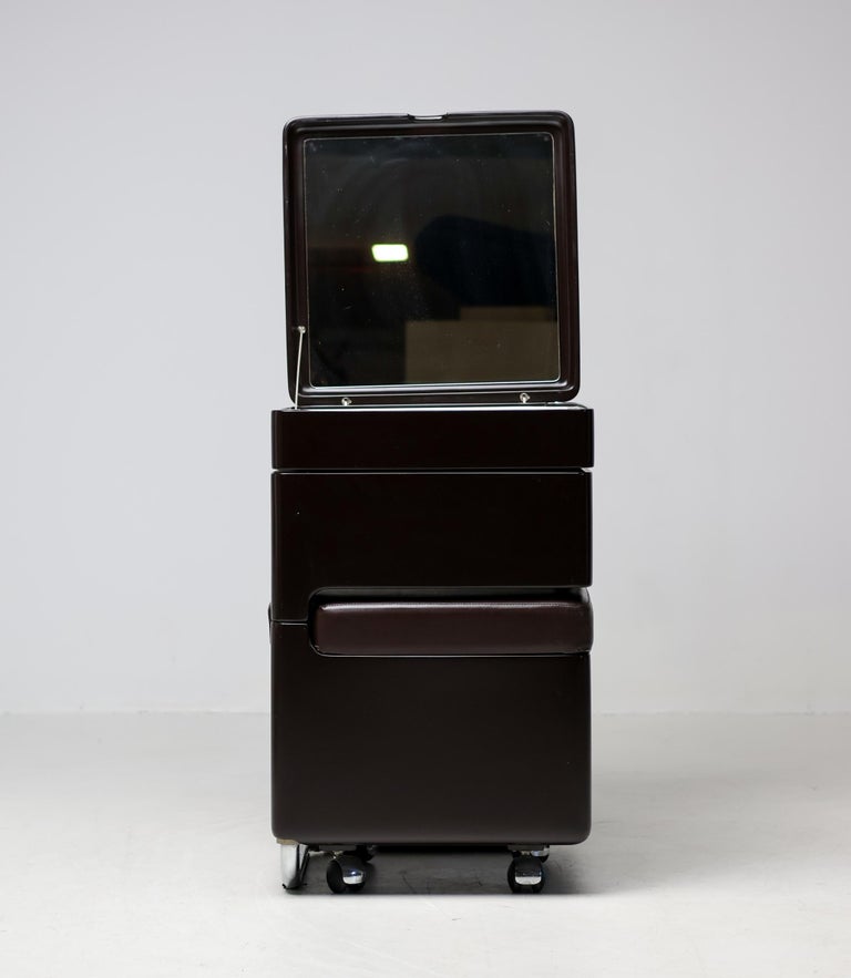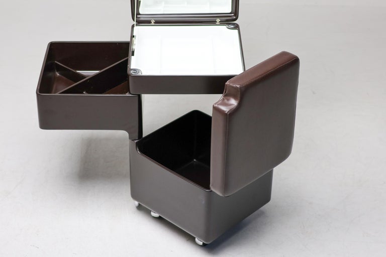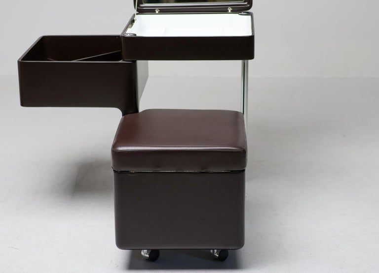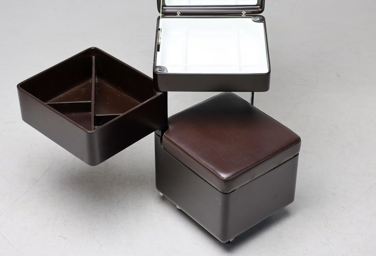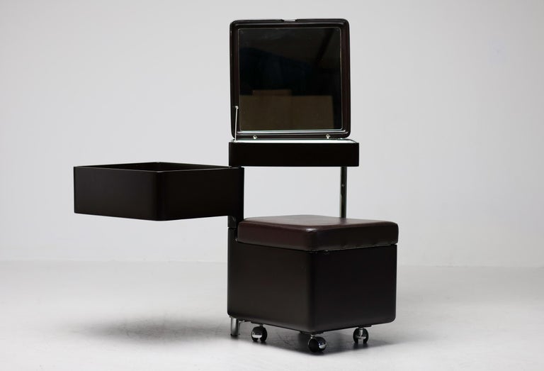 Modular Vanity by Carlo Urbinati, Italy, 1970s A rare and innovative modular vanity designed by Carlo Urbinati in the 1970s, exemplifying the forward-thinking spirit of Italian mid-century modern design. Crafted from high-quality dark brown PVC with chrome-plated steel and vinyl details, this multifunctional piece combines clean aesthetics with practical utility. The collapsible structure includes a spacious top compartment with an interior mirror, a concealed drawer, and ample storage beneath the padded seat. Designed to maximize function in compact spaces, it serves as both a vanity and seating solution—ideal for bedrooms, dressing rooms, or studio apartments. Urbinati’s design reflects the influence of Joe Colombo, whose modular and space-saving concepts reshaped contemporary living in the 1960s and ’70s. This piece captures that same spirit of adaptability and elegance, making it a sculptural yet highly functional addition to any interior. Condition: Very good vintage condition. Minor wear consistent with age and use. Dimensions: Height: 31.5 in (80 cm) Width: 20.5 in (52 cm) Depth: 20 in (51 cm)