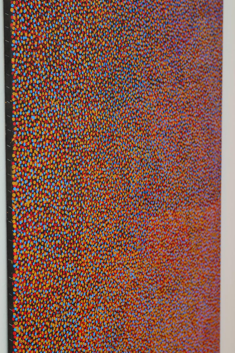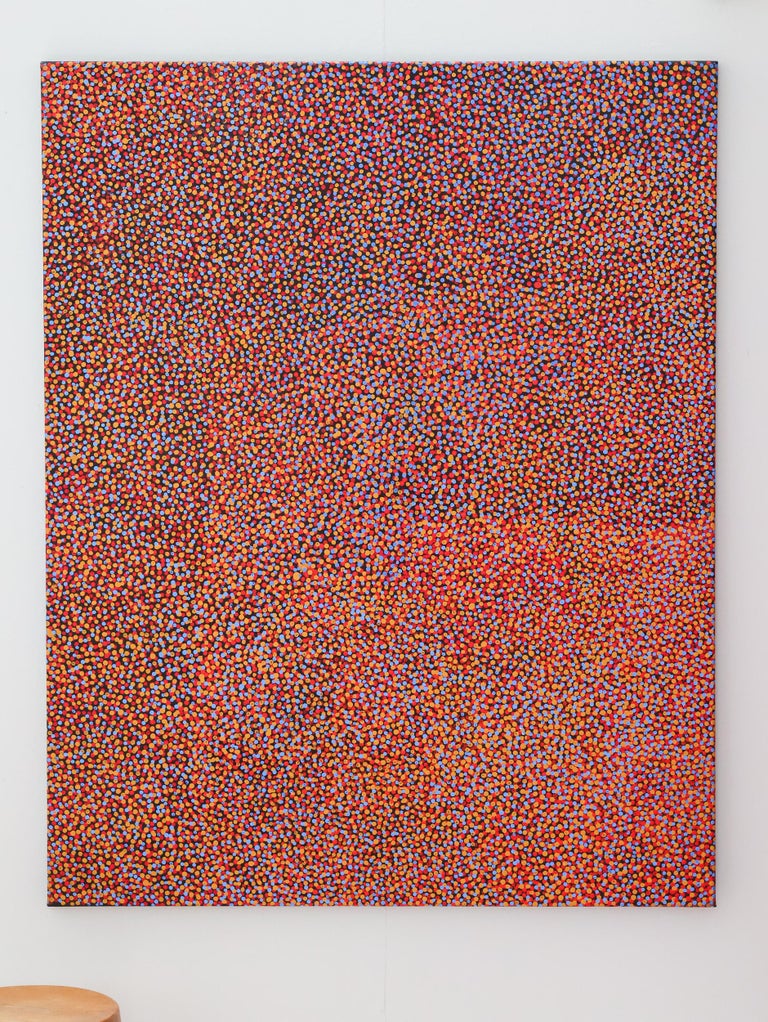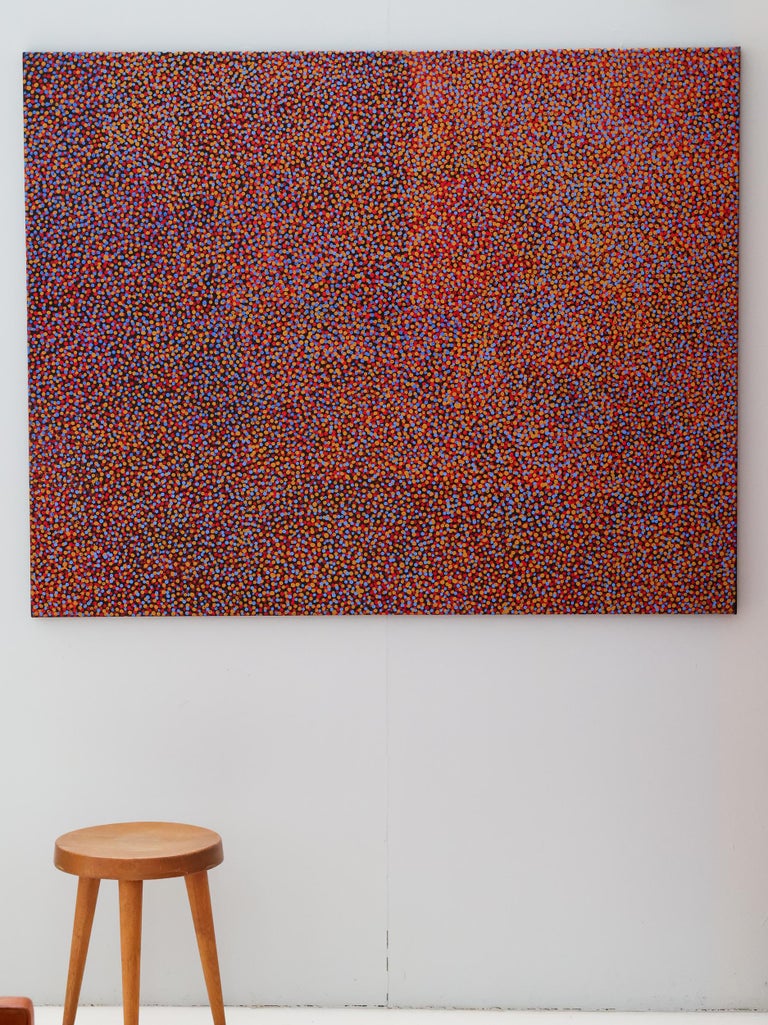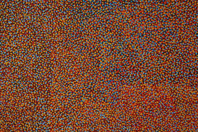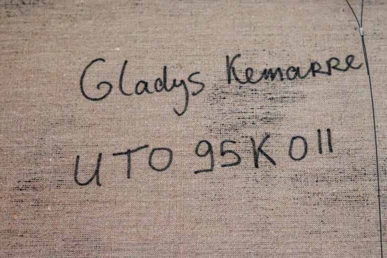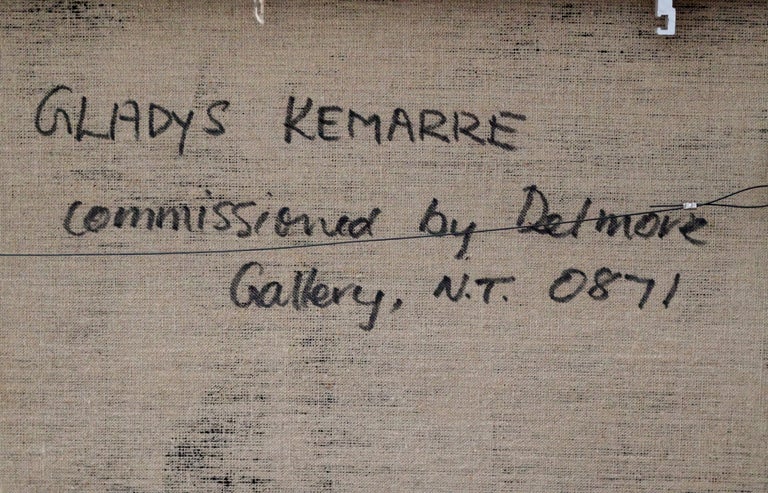 This captivating painting by Gladys Kemarre (1937-2017), a respected Anmatyerre artist from Utopia in the Northern Territory, is a powerful expression of Aboriginal Dreaming—a visual narrative tradition passed down through countless generations. The fine dot work of Gladys’ paintings depicts the ripening stages of the Anwekety (conkerberry) or Bush Plum Dreaming. The plant produces white flowers and berries, which when ripe, are edible and sweet to taste. The berries also feed a variety of wildlife including the emu, bush turkey and other native bird species. Gladys’ artworks simultaneously provide a topographical view of the landscape around Ahalpere, her Country in the Utopia region in Central Australia. As part of Gladys’ Dreaming, the women perform awelye ceremonies (women’s ceremonies), paying homage to the bush plum to ensure further germinations in years to come. Over the years Gladys has participated in multiple exhibitions around Australia and overseas including India, Germany, Korea and across Europe. Her paintings are held in prestigious collections around the world. Details: Artist: Gladys Kemarre Date: 1995 Origin: Utopia region, Northern Territory, Australia Medium: Acrylic on canvas Style: Contemporary Aboriginal Condition: Excellent, professionally stretched and ready to hang A striking and authentic work of Indigenous Australian art, this painting invites viewers into a deeper understanding of Country, kinship, and cosmology—through the eyes and hands of a masterful storyteller.