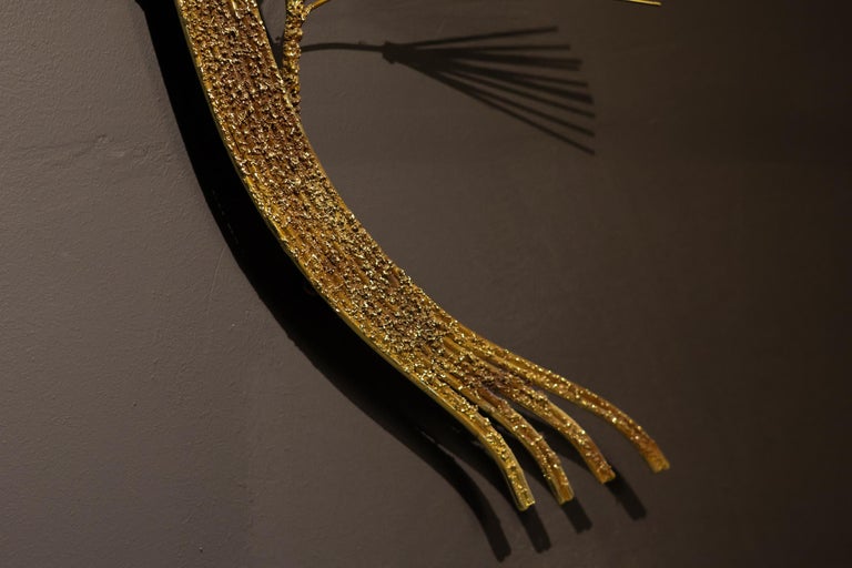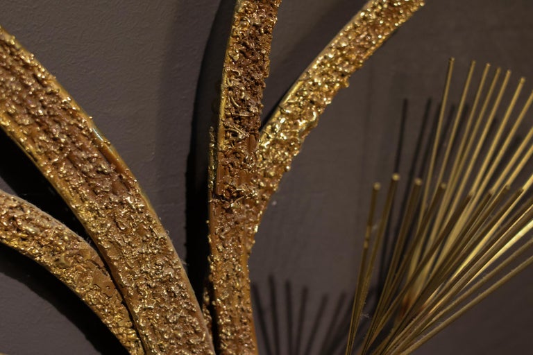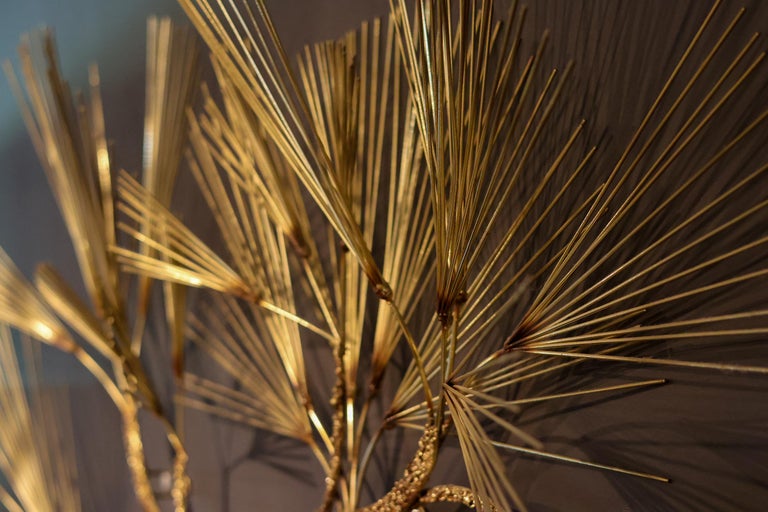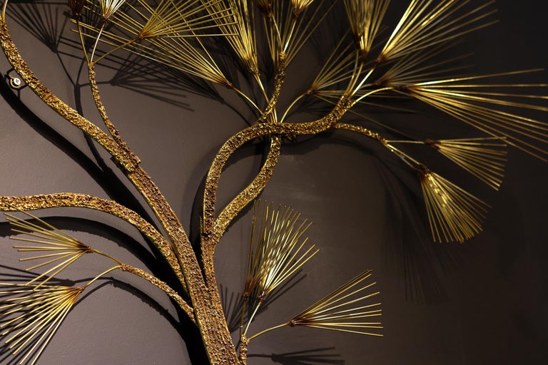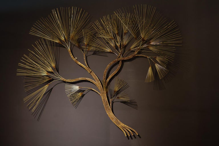Make a bold statement with this exceptional Mid-Century Modern brass wall sculpture by renowned design house Curtis Jeré, circa 1970s. This large-scale Brutalist tree composition features hundreds of delicate, hand-cut brass “needles” radiating from layered branches, creating a mesmerizing interplay of light, texture, and form. A signature example of Jeré’s celebrated work, this piece beautifully embodies the Brutalist aesthetic with its organic structure, dramatic silhouette, and warm golden patina. The sculpture commands attention while retaining an airy elegance—perfect for anchoring a modernist interior, entryway, or above a fireplace. Details: Artist: Curtis Jeré (C. Jeré for Artisan House) Style: Mid-Century Modern / Brutalist Materials: Hand-soldered brass Dimensions: 164 x 120 x 25 cm In excellent vintage condition with minor wear consistent with age. A collector’s piece and a rare opportunity to own one of Jeré’s most iconic and large-scale designs. Ready to hang and elevate your space.